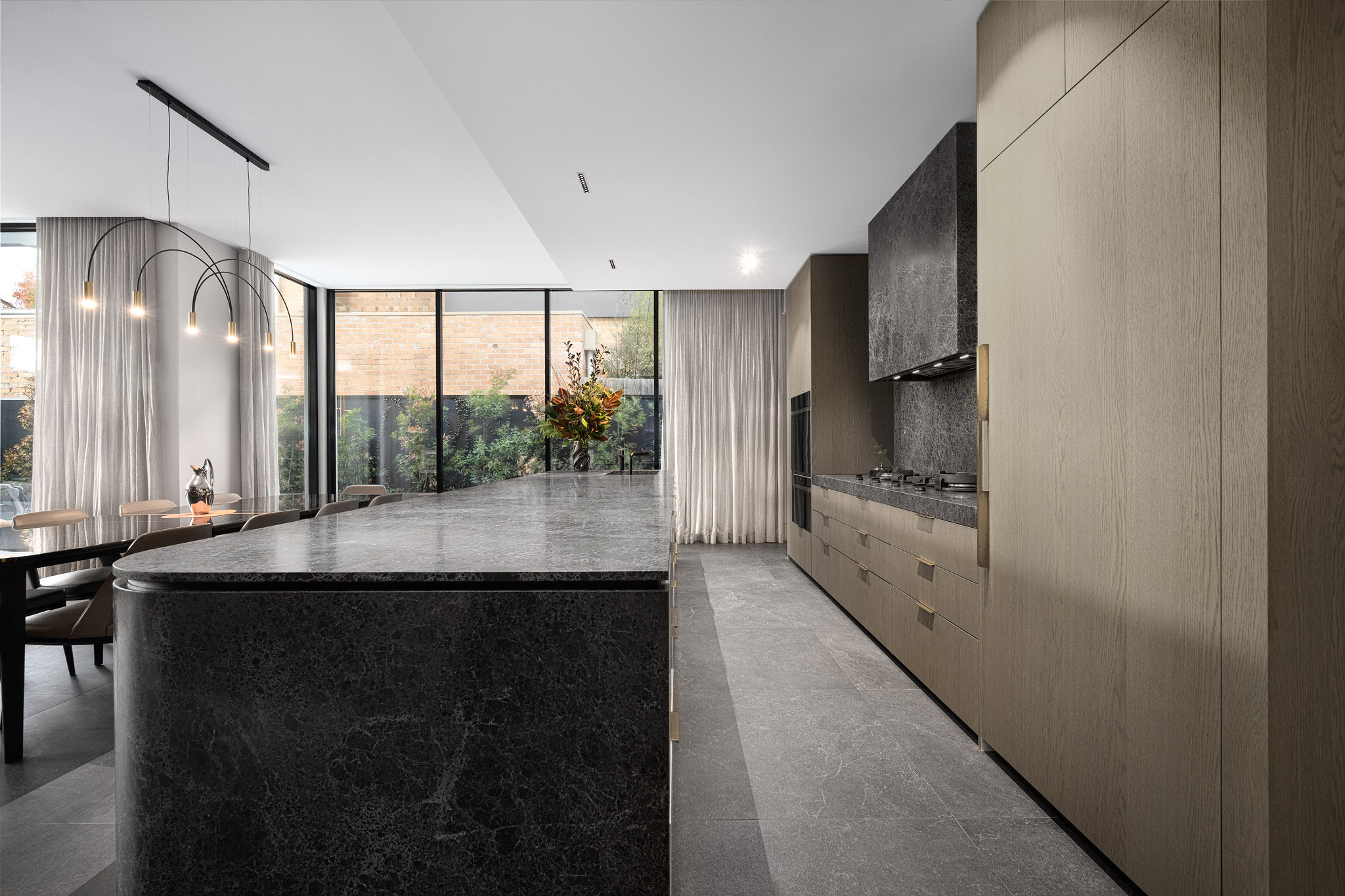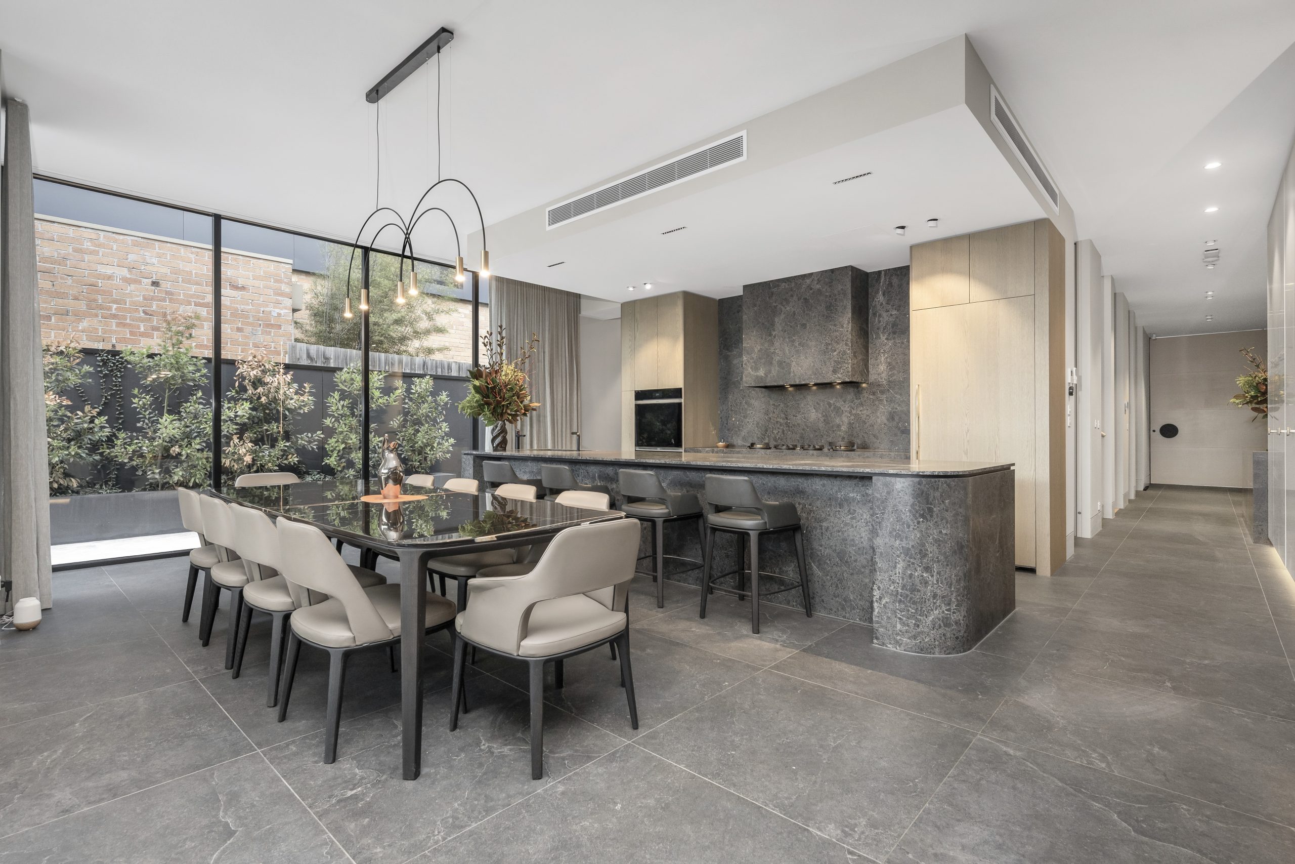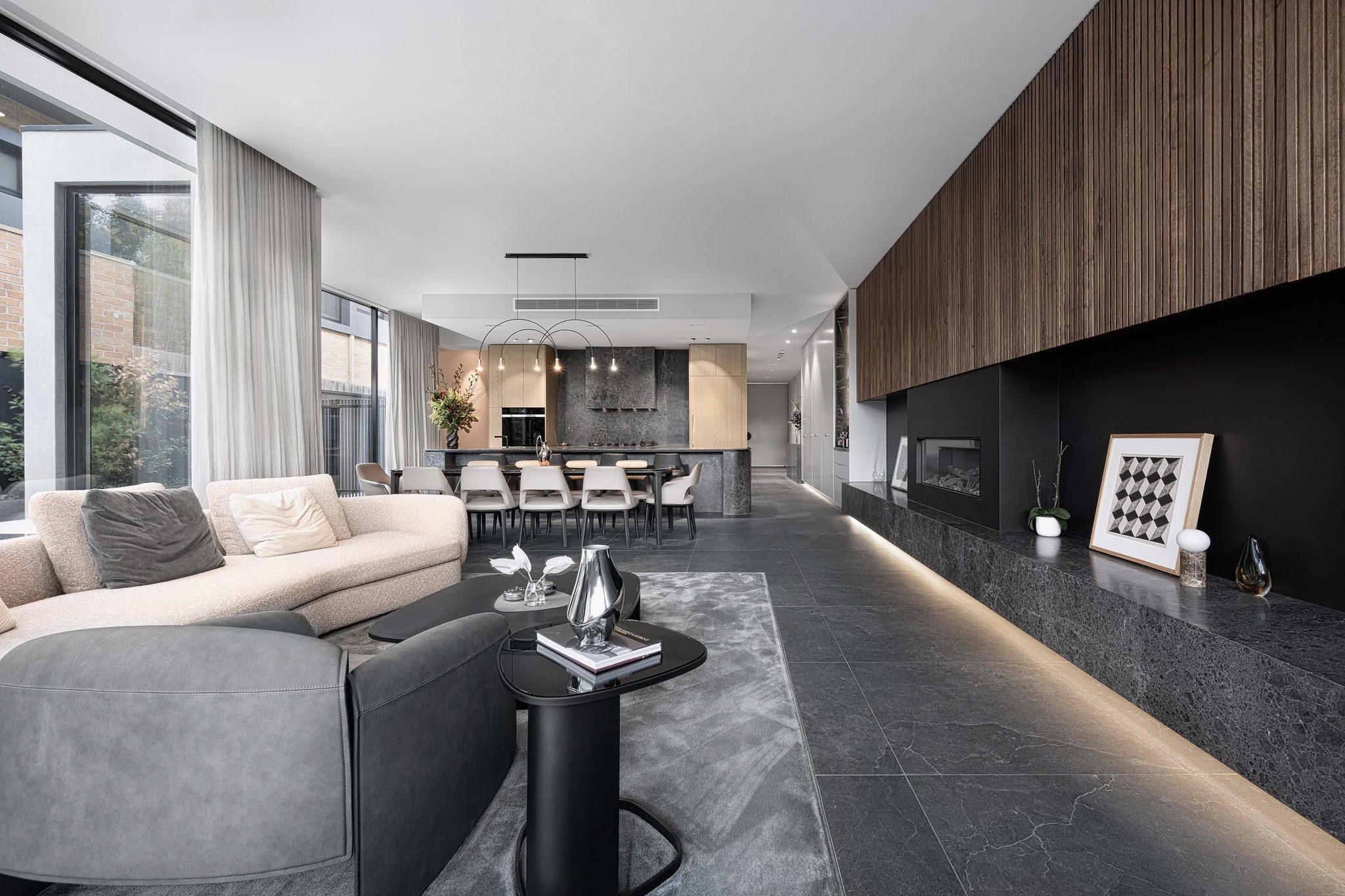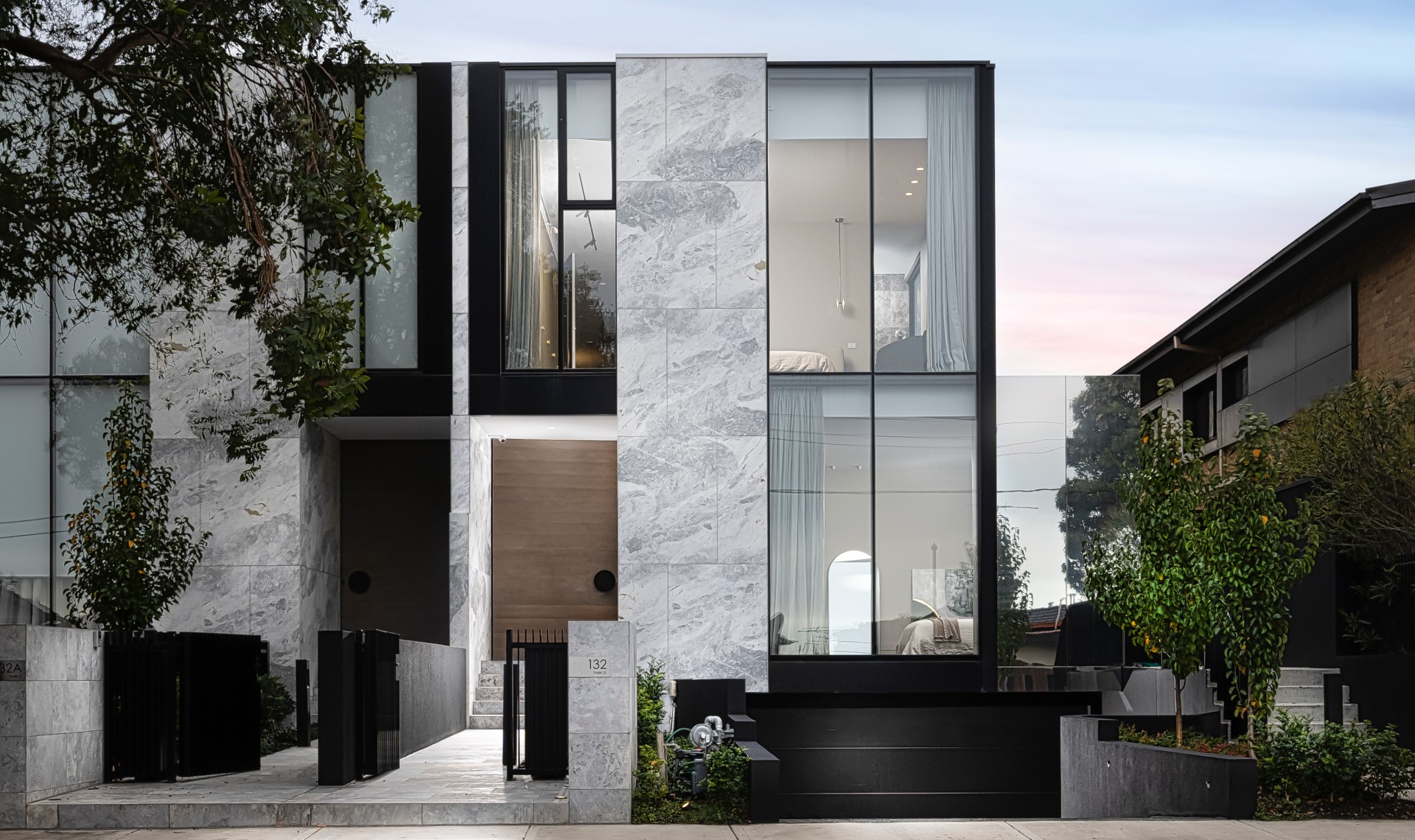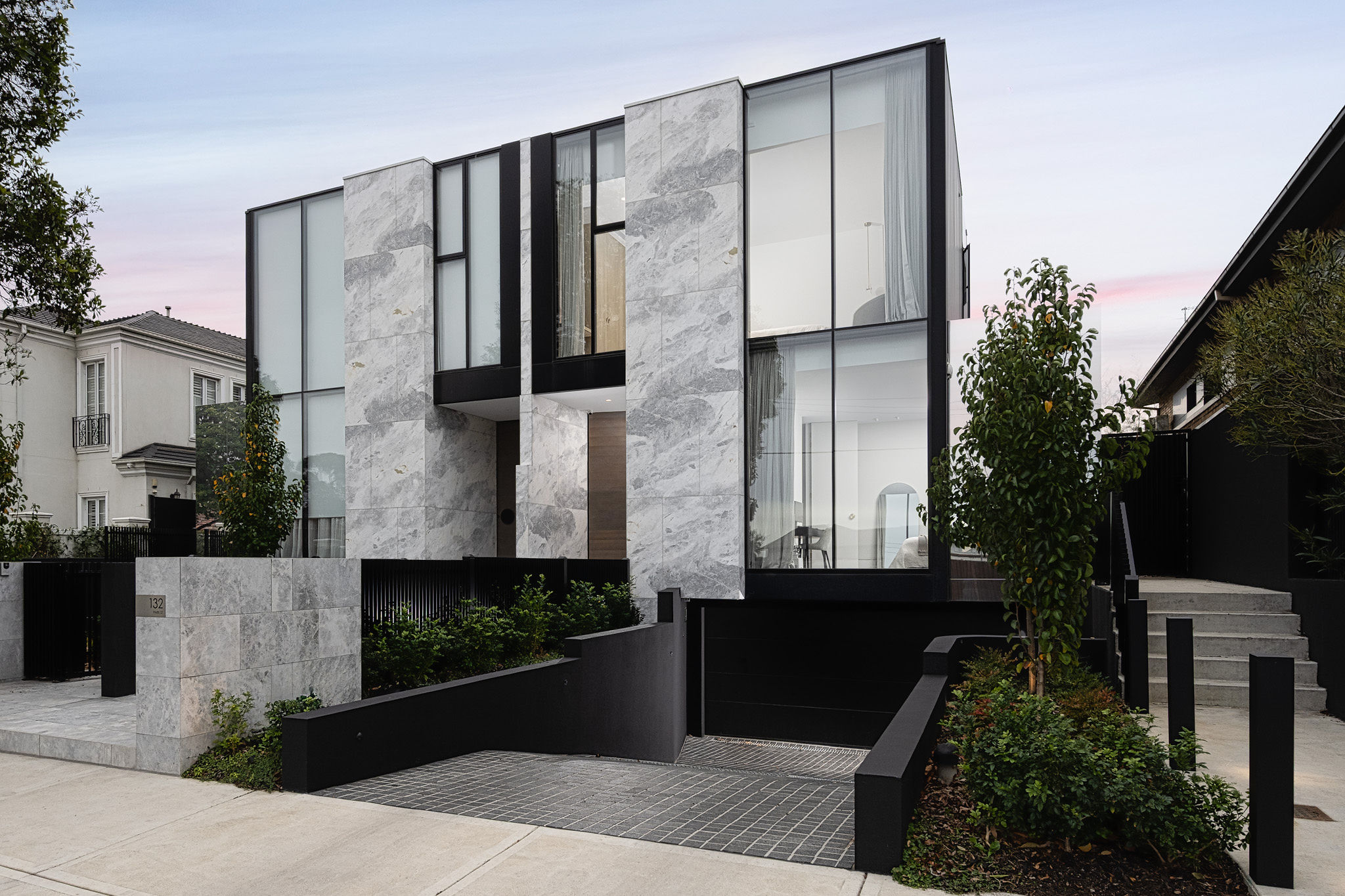 Park Street Residences offer two high-end generous townhouses showcasing a striking balance of modern elegance and refined minimalism. The façade features a sophisticated combination of natural stone, sleek glass panels, and bold black framing, creating a powerful sense of contrast and geometry. Expansive windows invite abundant natural light into the interiors, enhancing the open-plan layout and seamless connection between inside and out.