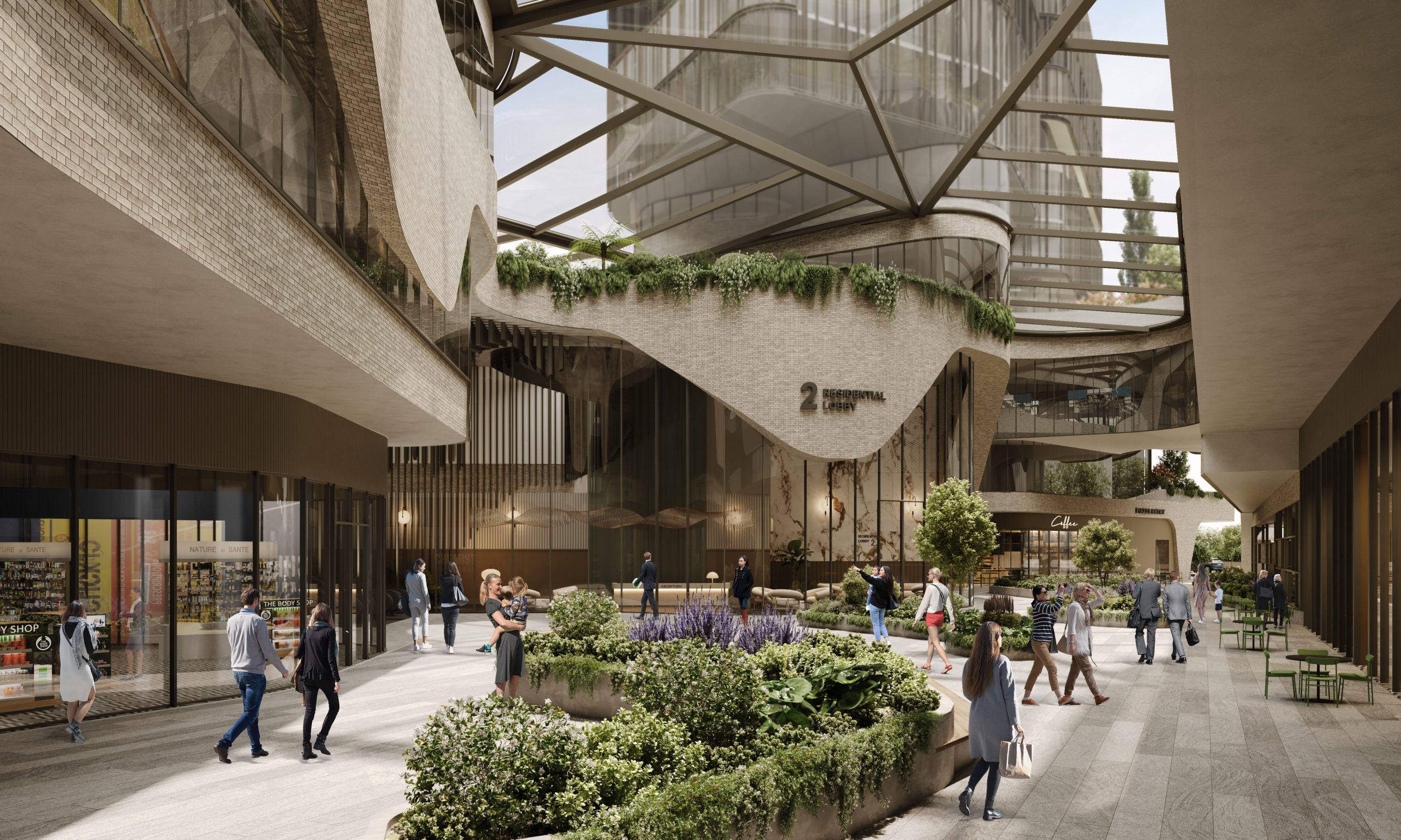 This design showcases a visionary approach to sustainable urban development. The building’s fluid, terraced form integrates natural elements throughout multiple levels, creating a seamless dialogue between nature and modernity. Lush greenery cascades from the balconies and rooftop gardens, softening the sleek glass and metal façades while promoting environmental harmony. Expansive glass walls invite natural light deep into the structure, fostering openness and connection between the interior and exterior spaces.