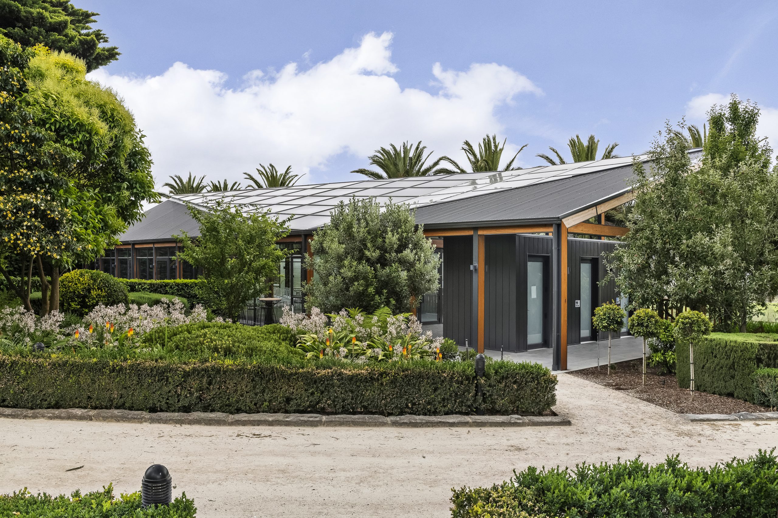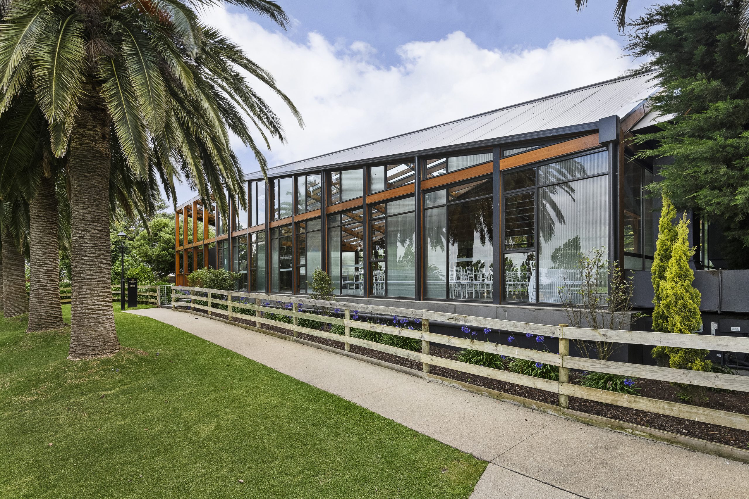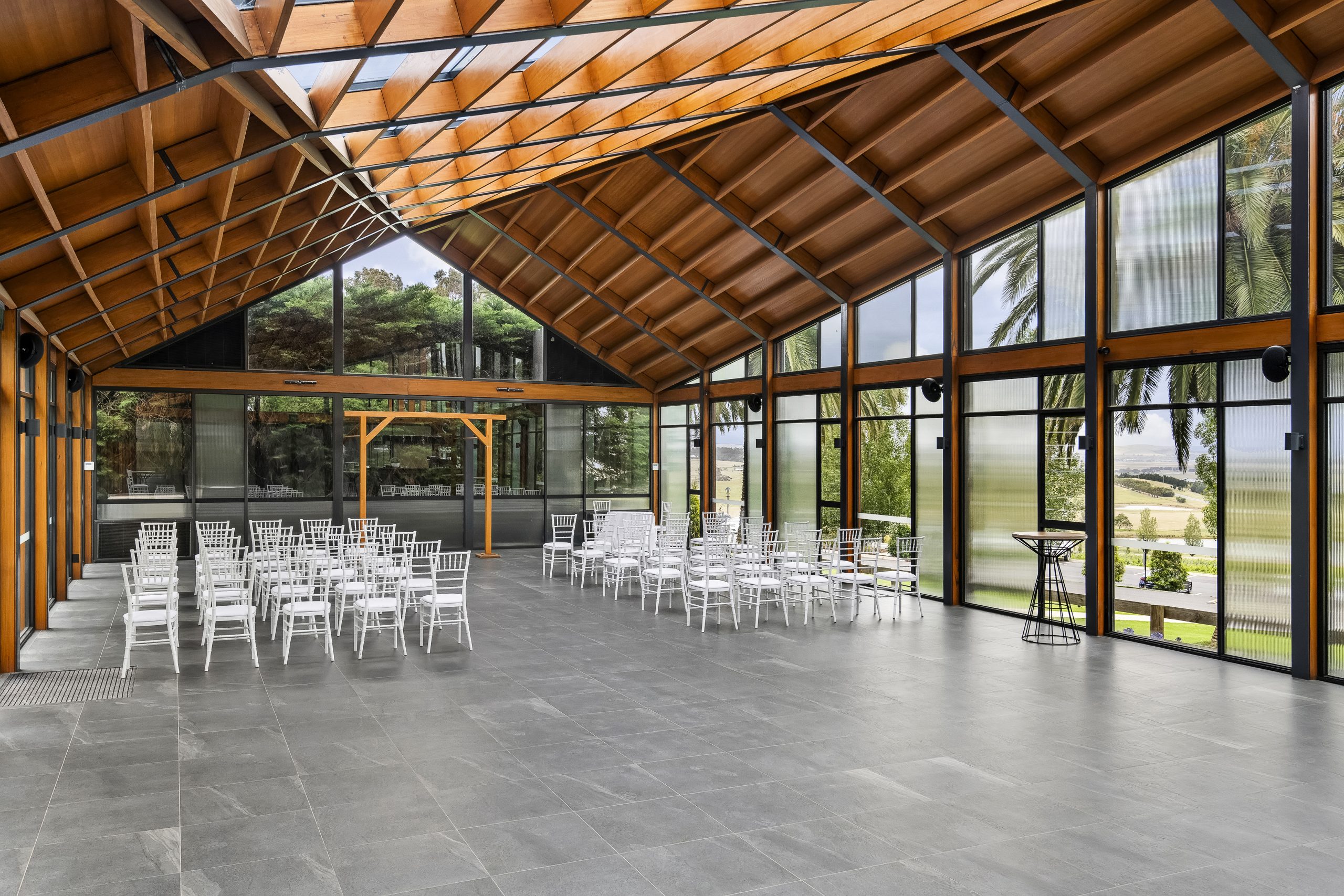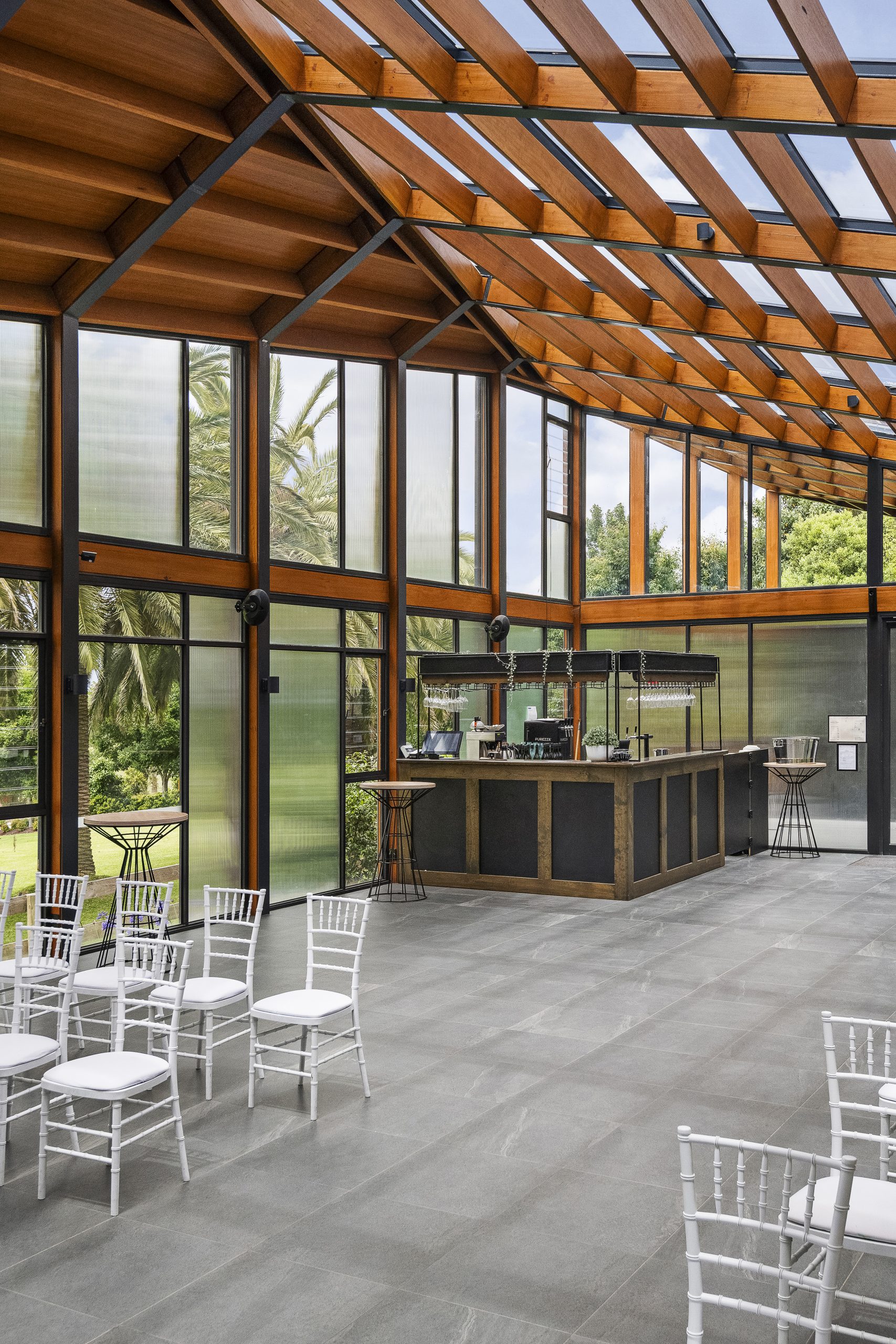 The venue itself is defined by its contemporary architectural expression, featuring soaring volumes, generous glazing, and refined materiality that emphasise openness and light. Floor-to-ceiling glass blurs the boundary between interior and exterior spaces, drawing the surrounding greenery and natural vistas into the heart of the building.